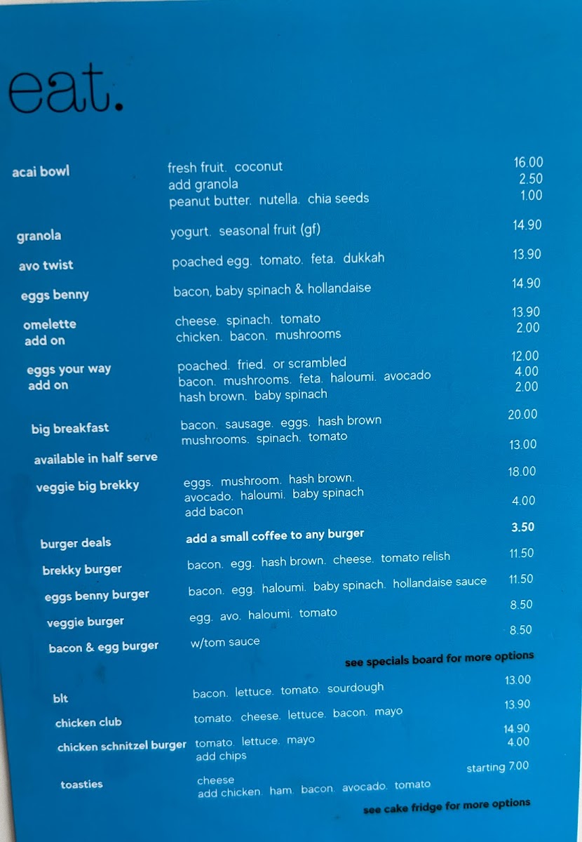 Highlights of the menu include the Acai Bowl topped with fresh fruit and customizable add-ons like Nutella or peanut butter for just A$16. For egg enthusiasts, the Eggs Benny featuring crispy bacon and fresh spinach offers a luxurious morning treat. Pair your meal with one of their freshly blended smoothies or invigorating juices, each priced at A$7.50, designed to cleanse and energize.